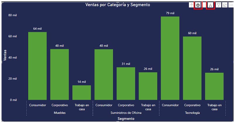 Confirmamos que la opción de exploración en profundidad está activada y seleccionamos el icono de expandir hacia abajo.  El gráfico muestra más detalles. Ahora muestra la Categoría, y el Segmento.